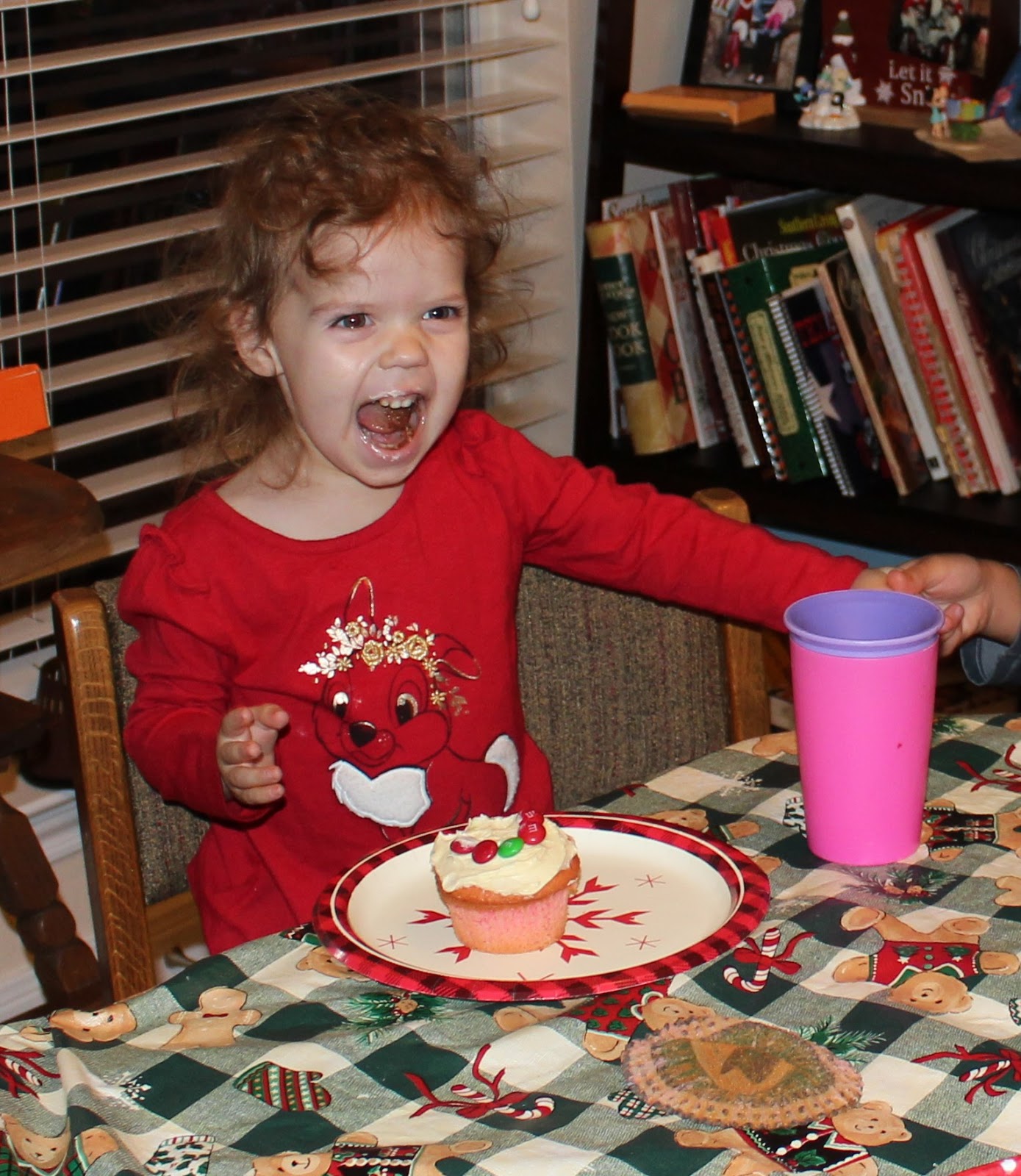 | Daphne hid under the table while we sang to her (little stinker!) and then we coaxed her out to blow out her candles. |